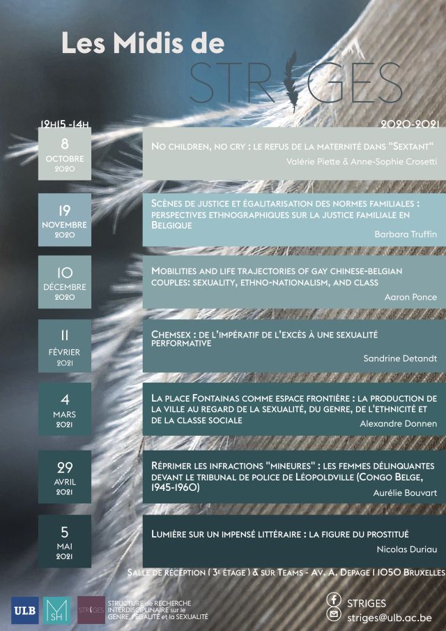 Les Midis de STRIGES reviennent pour l’année académique 2020-2021 ! De l’urbanisme à la pharmacie en passant par la sociologie, l’histoire ou encore le droit, les Midis s’inscrivent dans une perspective interdisciplinaire où tous les sujets ont pour lien les études de genre.
