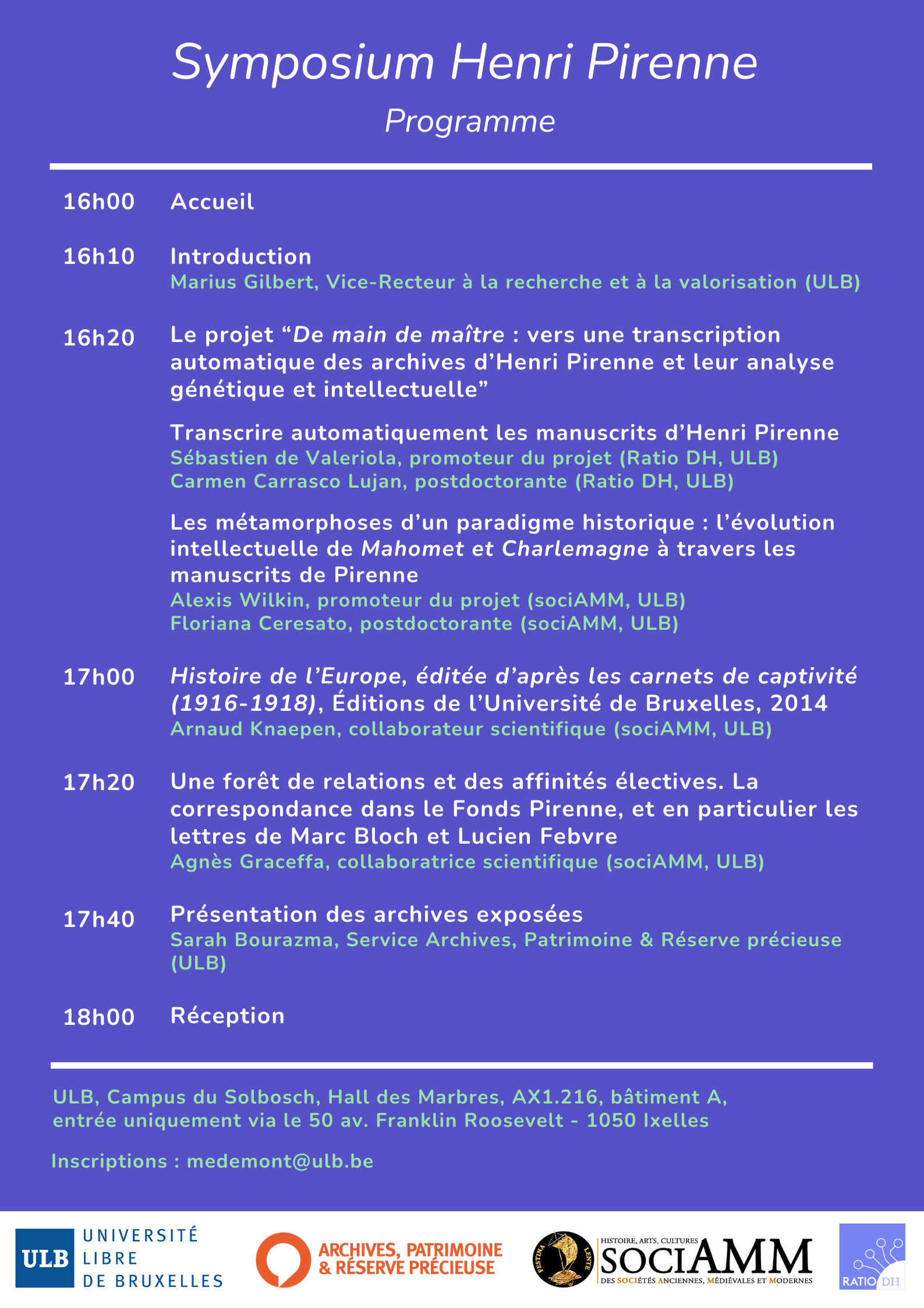 Organisée à l’occasion du 40ᵉ anniversaire de la constitution de ce fonds d’archives exceptionnel, cet événement s’inscrit dans le cadre du projet de recherche « De main de maître : vers une transcription automatique des archives d’Henri Pirenne et leur analyse génétique et intellectuelle », dirigé par Sébastien de Valeriola (Ratio DH) et Alexis Wilkin (sociAMM).